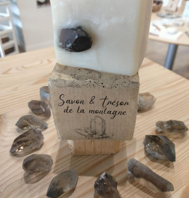 C'est l'association d'un savon doux au miel de Haute-Savoie et cire d'abeille, (sans huile essentielle, voir descriptif du savon Mila) et d'une pointe de quartz blanche ou fumé ramassé lors de la fonte des neiges : des blocs de roches se décrochent de la montagne et contiennent des trésors de la nature qu'un Cristalier de Haute-Savoie découvre avec passion autour du Mont-Blanc....